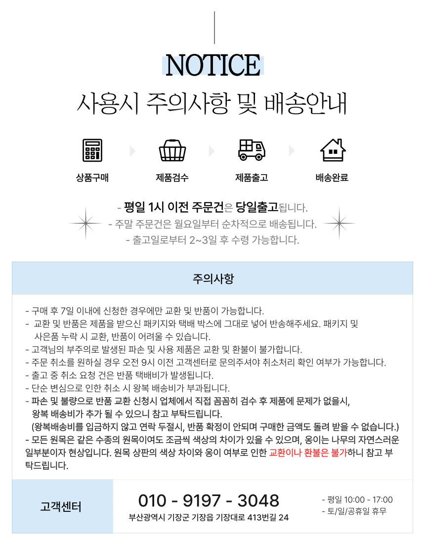 - 기본 배송기간 이상 소요되는 상품이거나, 품절 상품은 개별 연락을 드립니다.